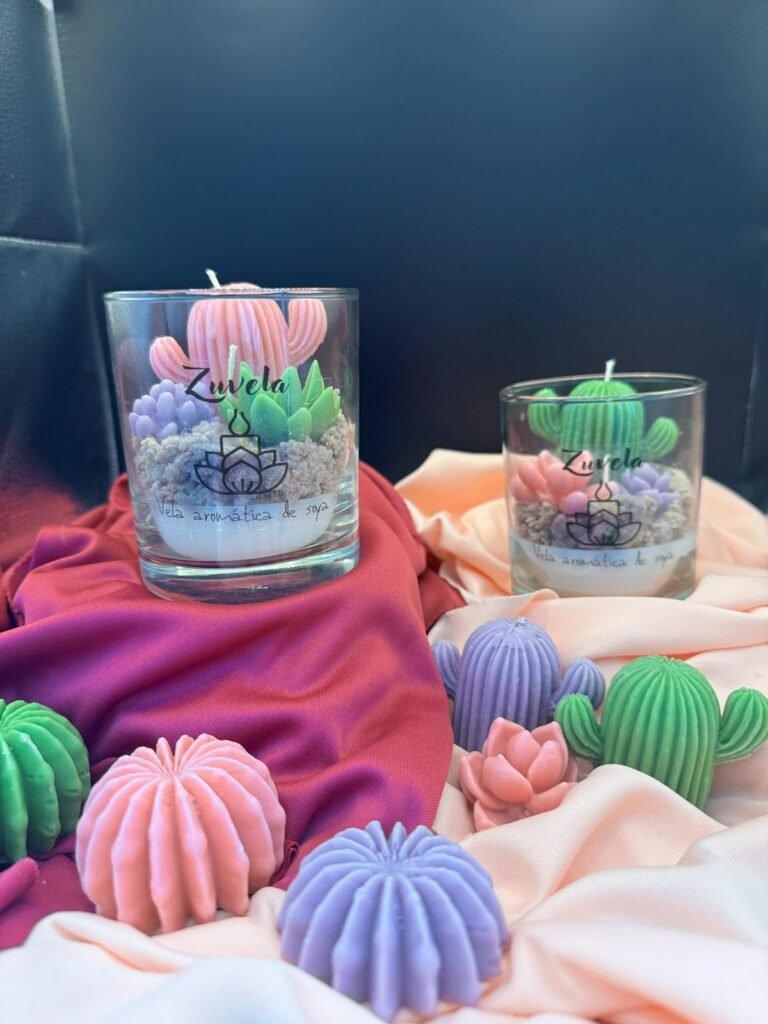 Son velas de cera de soya, la cual proviene de un recurso renovable, lo que la hace más amigable con el medio ambiente